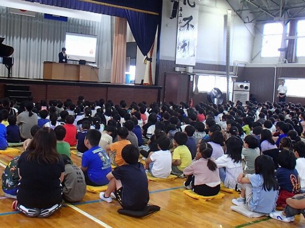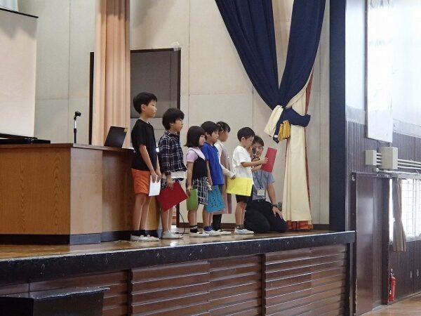 全校が集まって行う大切な式です。1・3・5年生の代表児童の話や校長先生のお話を聞き、